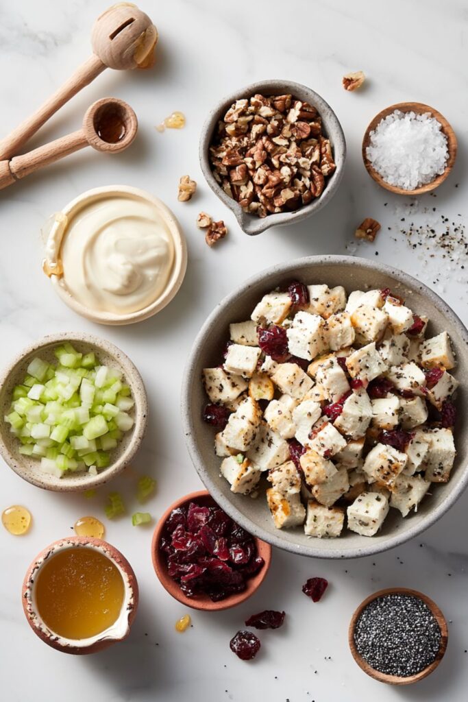 - 2. Chop the mix-ins: Add the finely diced celery, dried cranberries, and chopped pecans to the chicken.