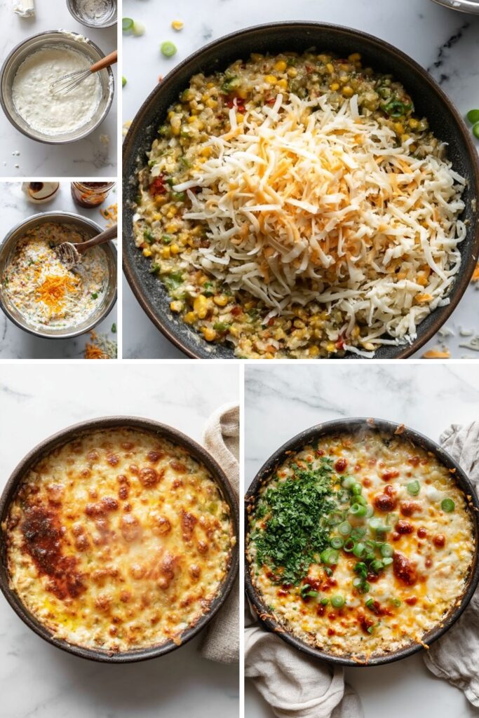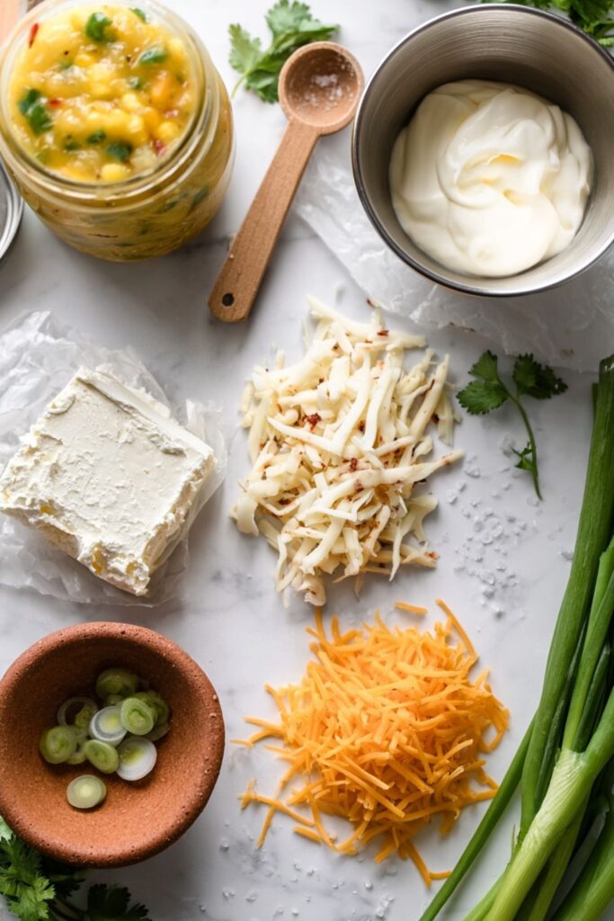 • Fold the ingredients: Stir in the jarred corn salsa, half of the pepper jack, half of the cheddar, and the green onions.