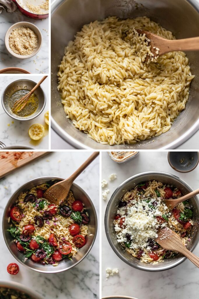 • 3. Combine the Base: Add the warm orzo directly into the bowl with the dressing and toss until completely coated.